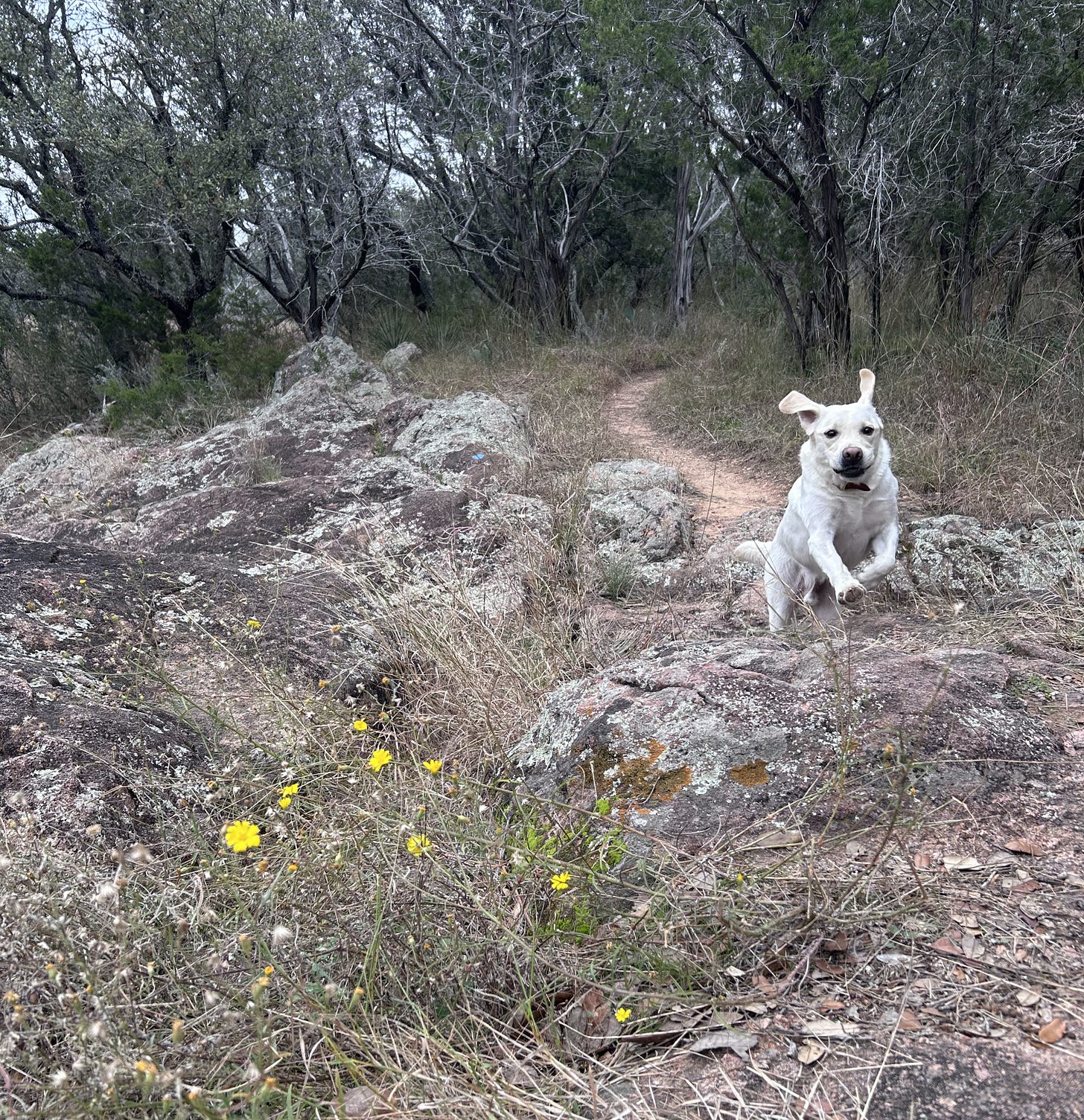 Charging nose first with rocks and stumps and stone steps only a canvas for his speed and agility he pounds down the trail, his ears waving in praise as his sturdy legs and lungs take them all in a bound. And if you see him only as a white blur as he goes by, you may think he only flies one way like an arrow from a bow. But if the distance between us grows too great, he’ll pause and look back with an encouraging smile, tongue set silly to the side. And if he feels an invisible tug after he has rounded a corner so that brush or rock are between us, he’ll bound back ’til he set eyes on me. Certainly he wants to lead his own life, to be out in front and yet, he doesn't want to go it alone. And who can blame him? Is this not what it is to be both tame and wild— bravely charging into the unknown without forgetting there is an umbilical cord of love sending you your strength and courage? Ben, teach me to be both tame and wild! _written December 28 2025
